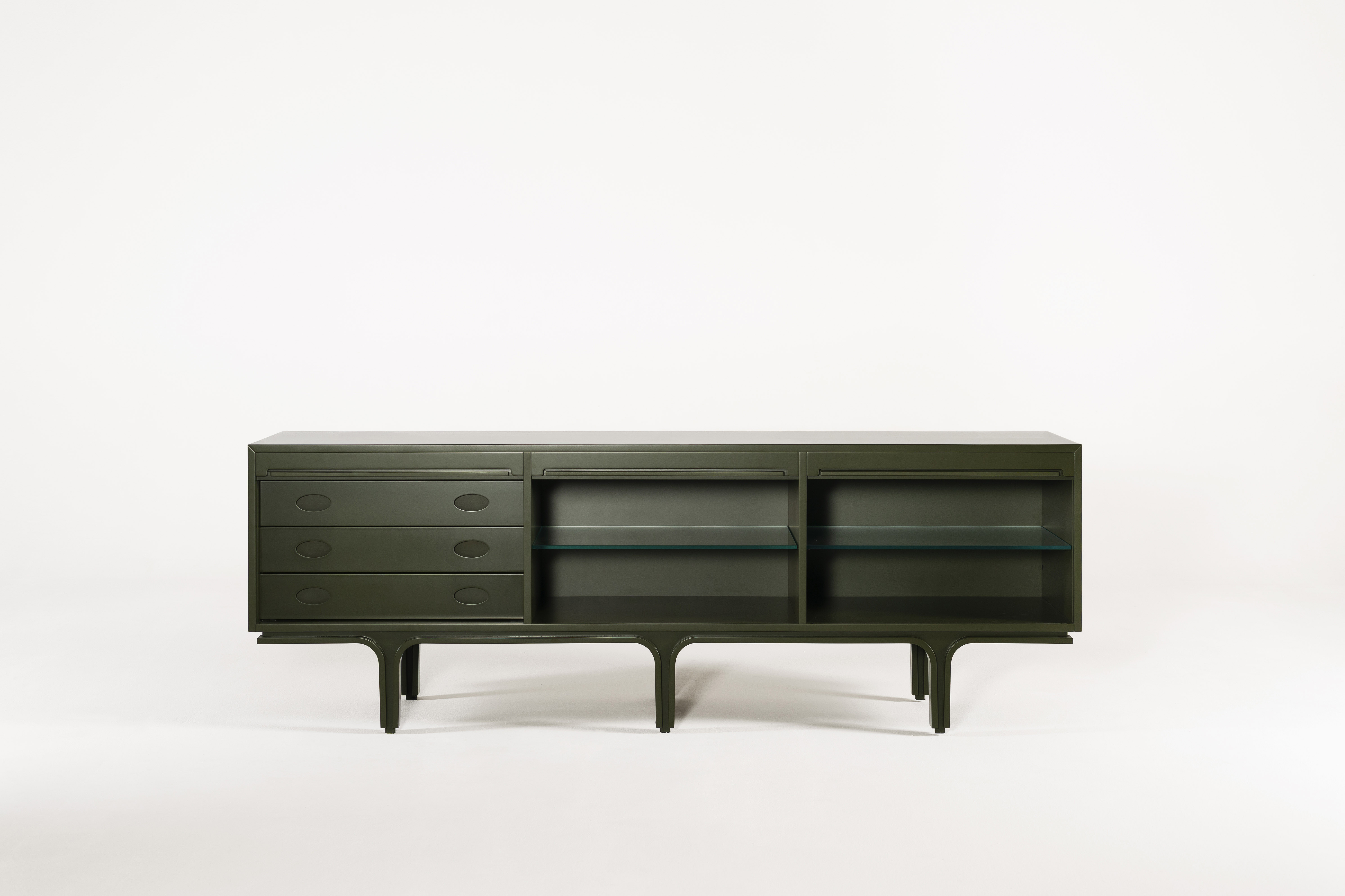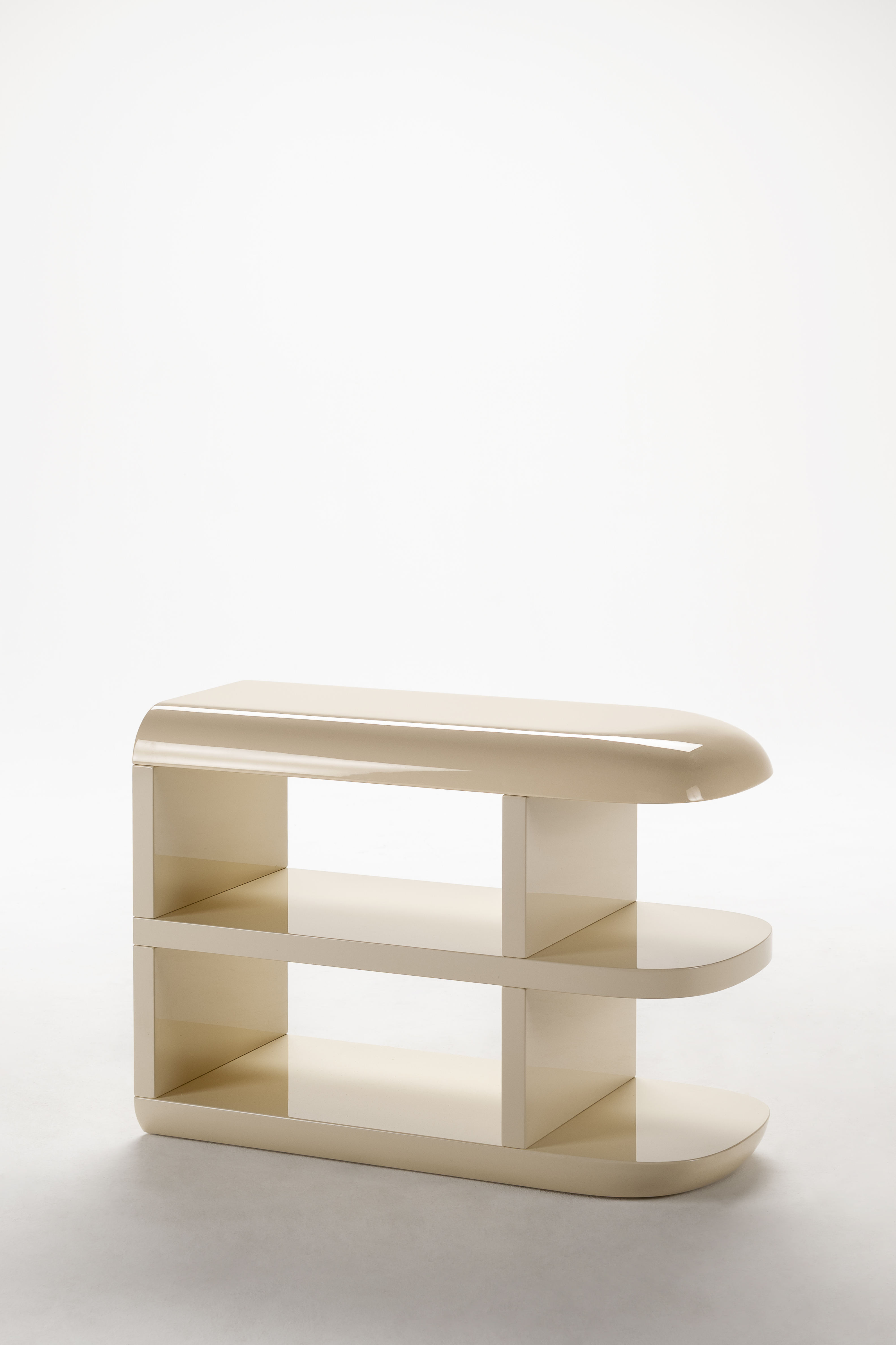 Nella versione lucida, le lacche interagiscono con la luce: le superfici riflettono, vibrano, amplificano il volume, rendendolo più dinamico e scenografico. Nella versione opaca, la luce viene assorbita: la presenza si fa più profonda, più materica, più silenziosa, suggerendo una dimensione intima e tattile.