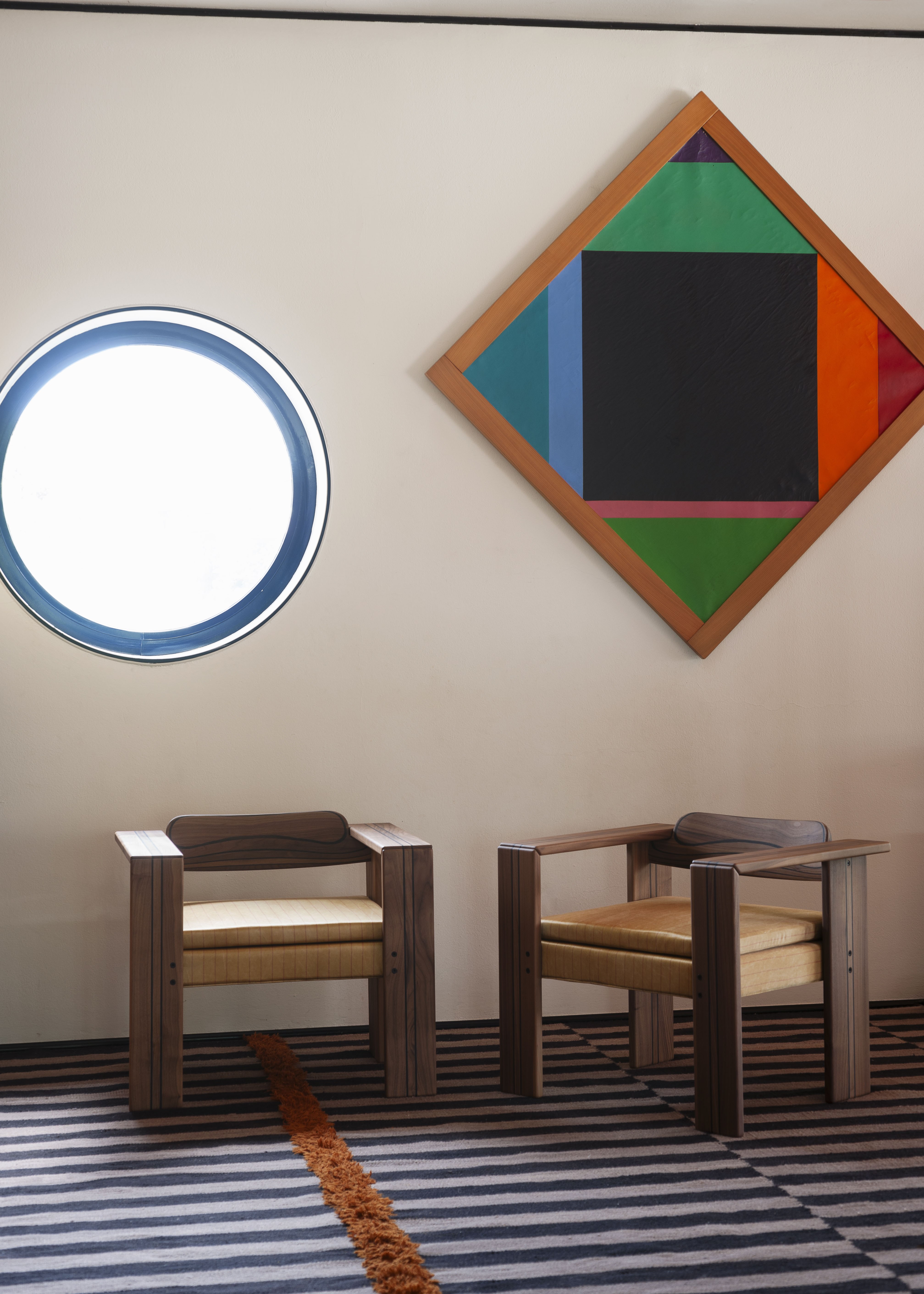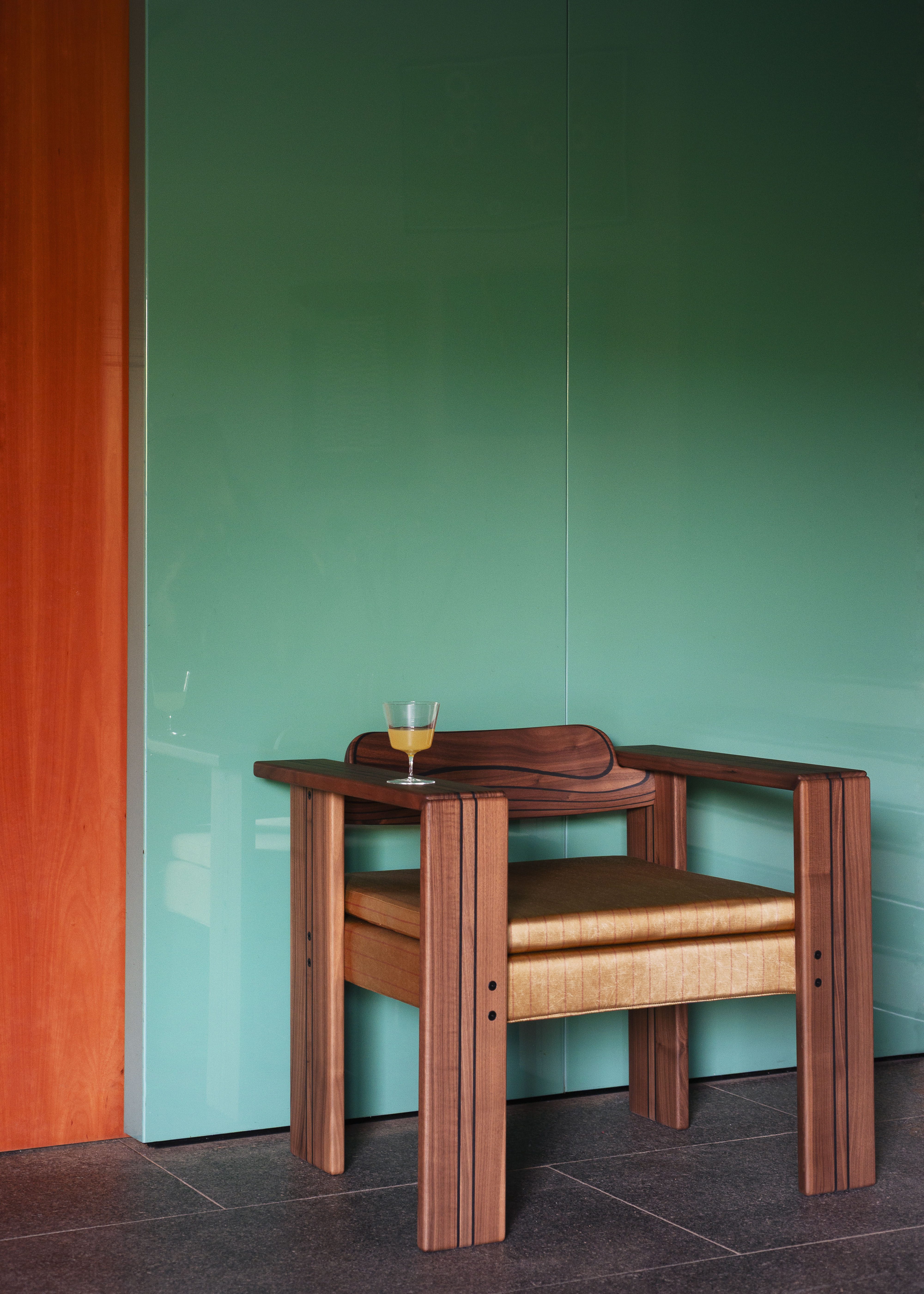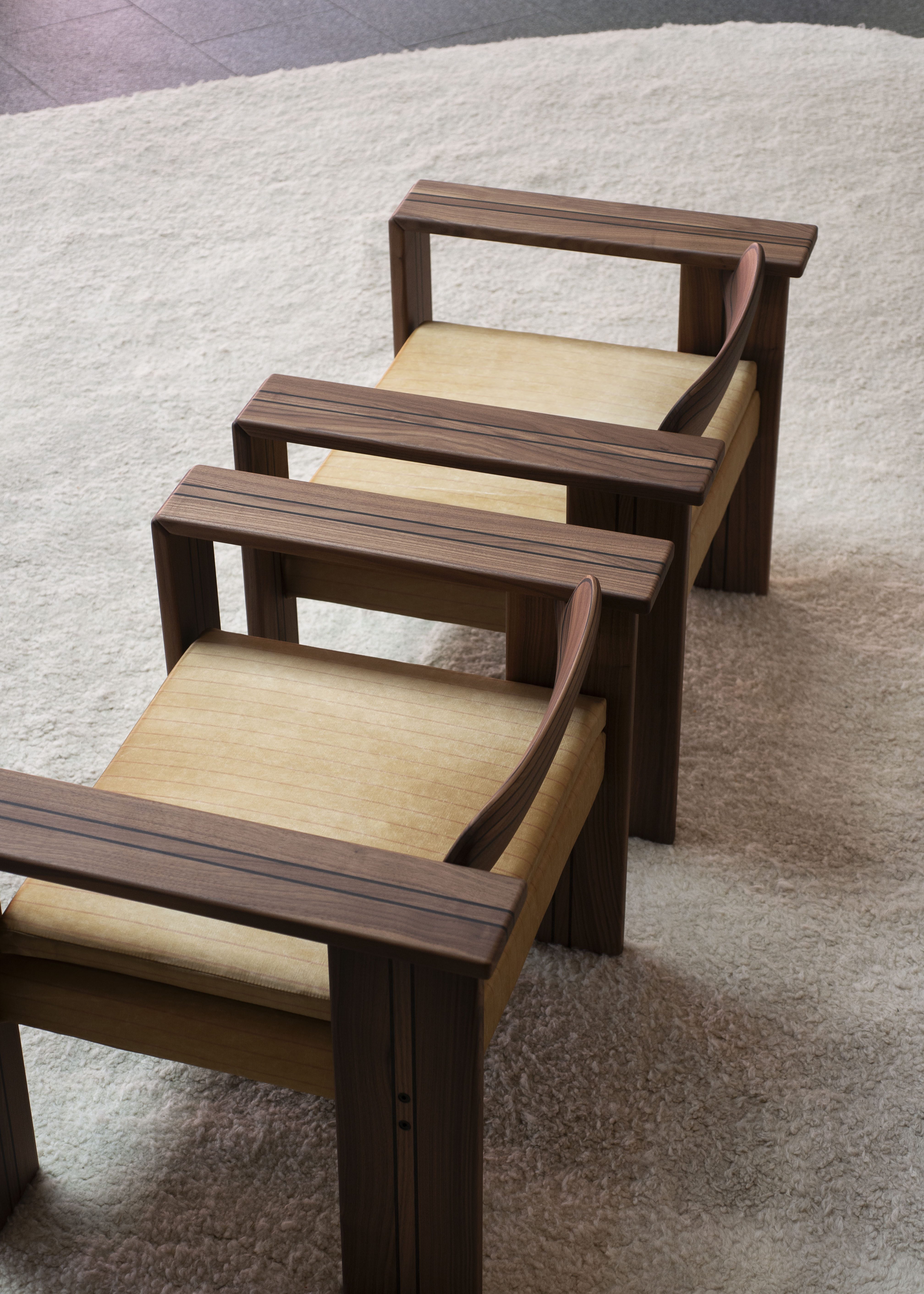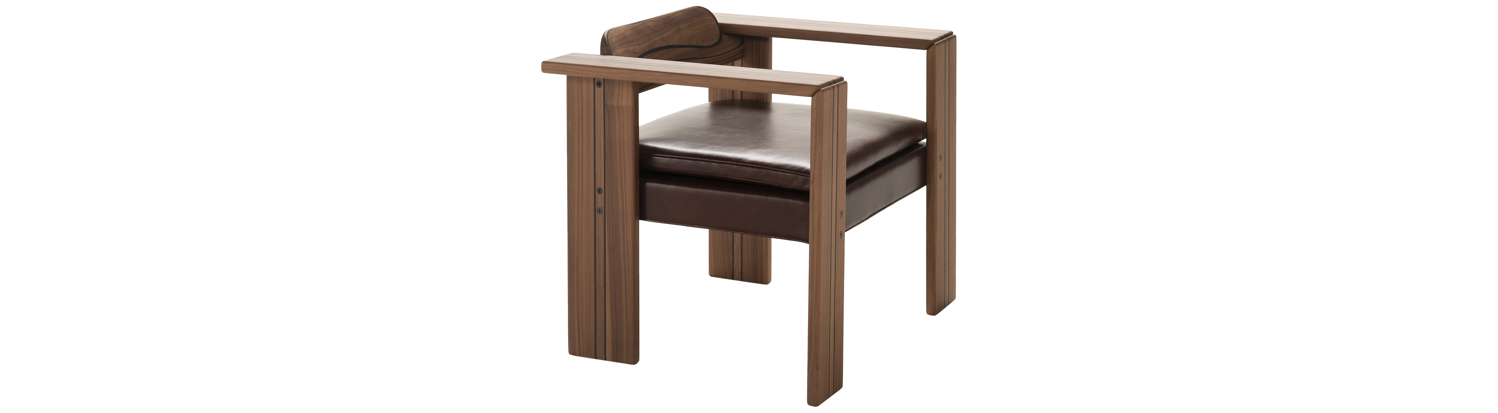 Designed by Afra and Tobia Scarpa in the mid-1970s, Artona carefully balances rigour and comfort, protection and stability, qualities it conveys through its very presence. The armchair is conceived as a micro-architecture of vertical and horizontal planes: two “L”-shaped elements serve as both support and armrest, while the backrest introduces the only soft gesture, tempering the geometry of the design. The interplay of layered wood animates the surfaces, revealing refined cabinet-making expertise and a quality shaped by time, proportion and care.