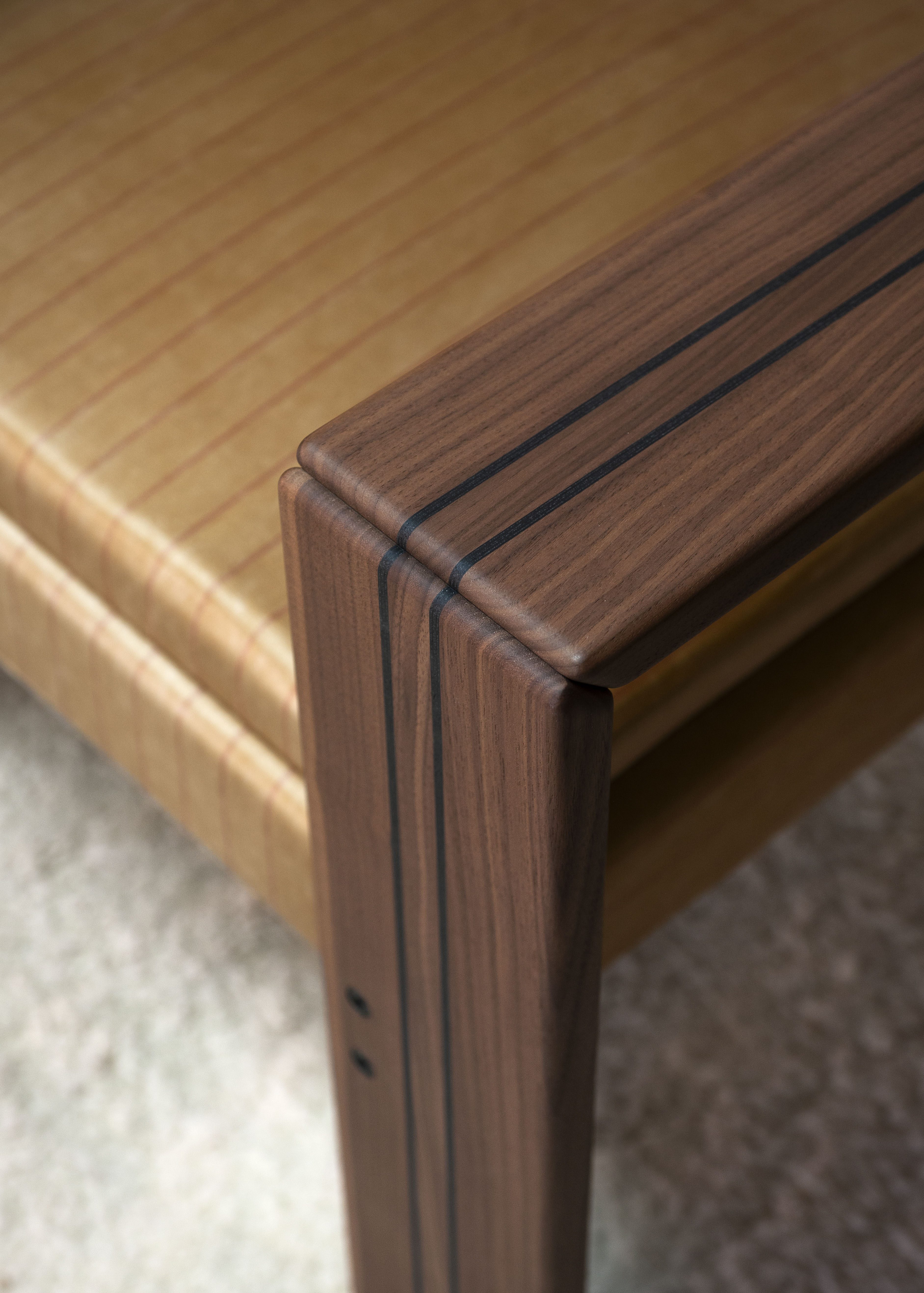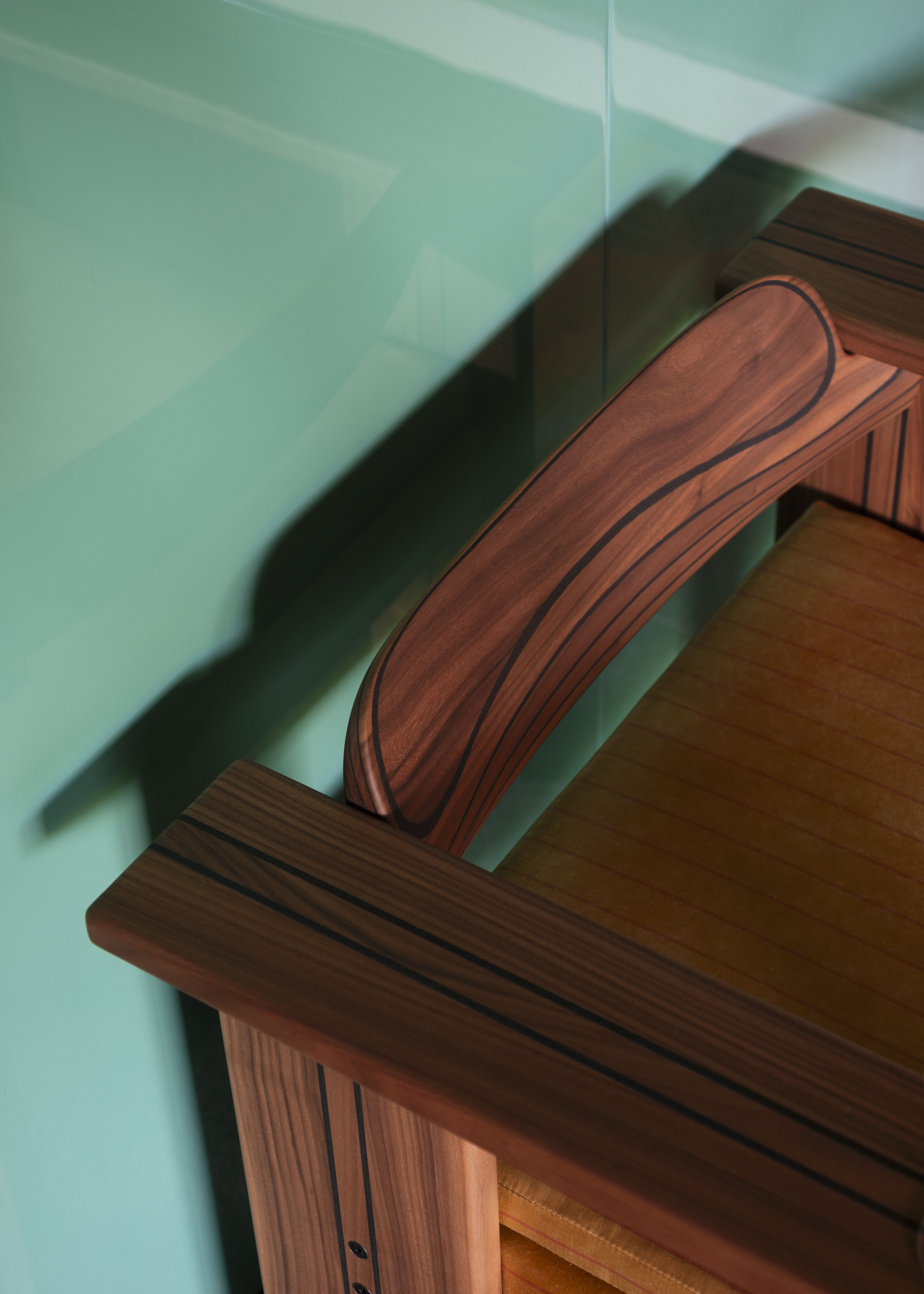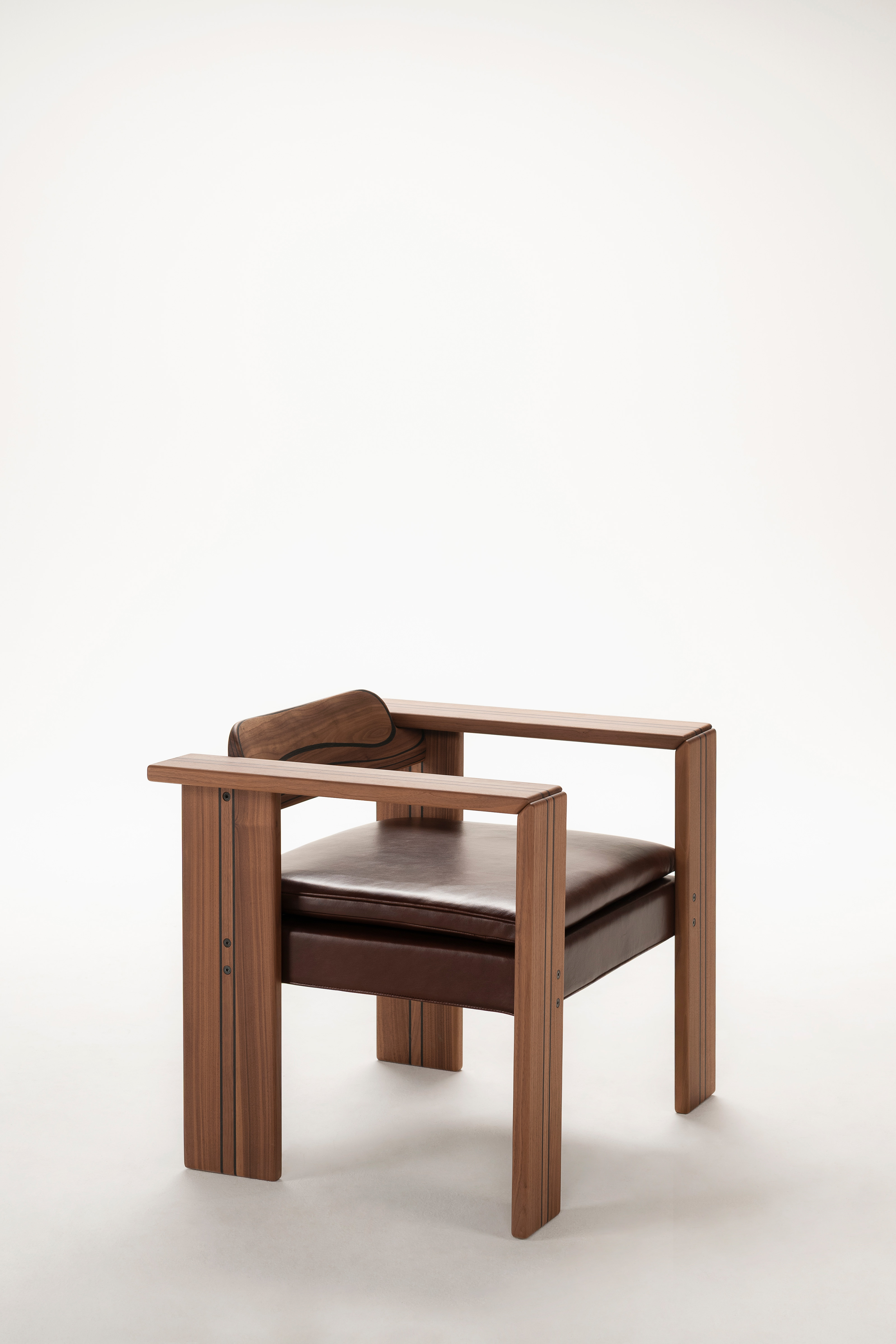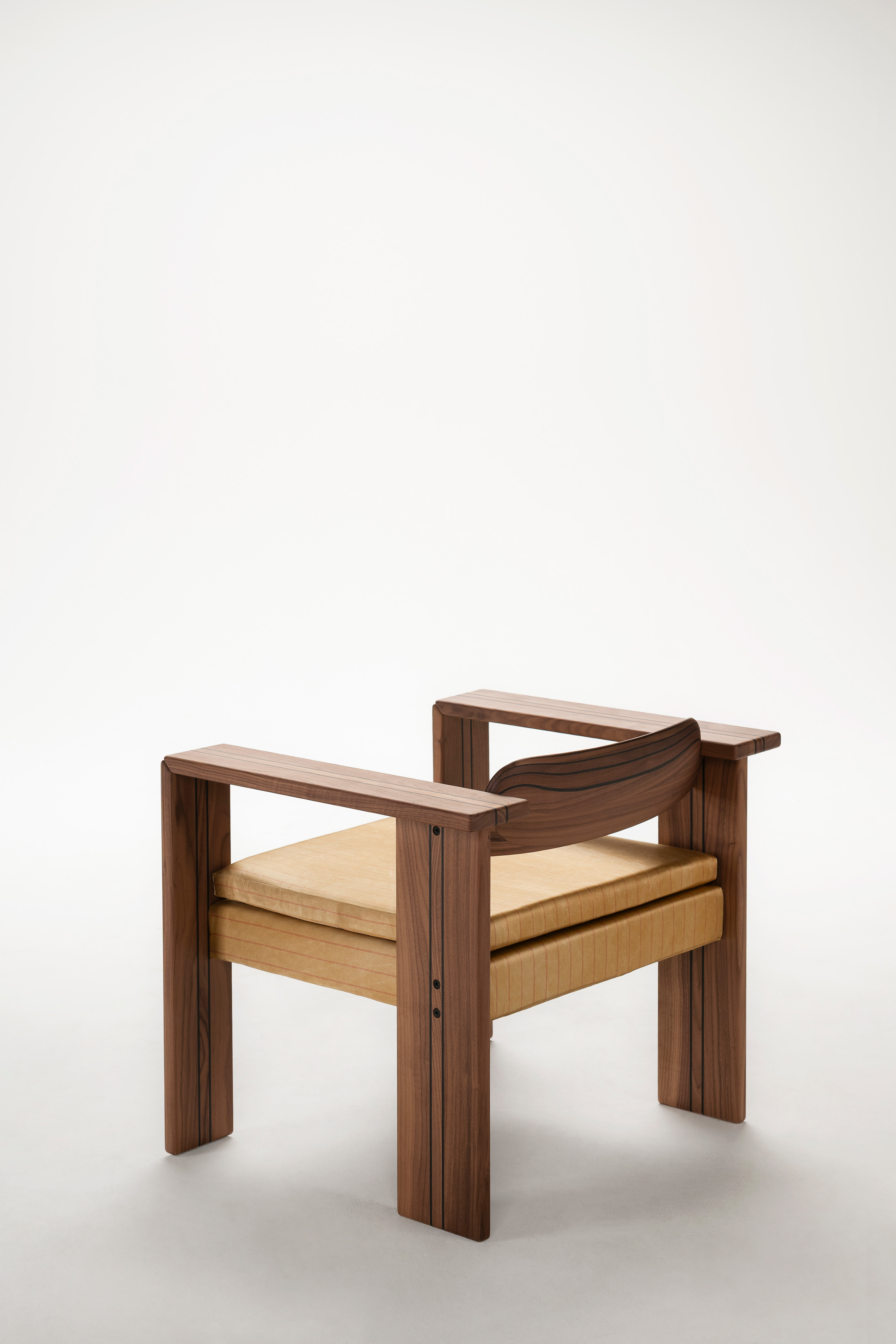 Designed by Afra and Tobia Scarpa in the mid-1970s, Artona carefully balances rigour and comfort, protection and stability, qualities it conveys through its very presence. The armchair is conceived as a micro-architecture of vertical and horizontal planes: two “L”-shaped elements serve as both support and armrest, while the backrest introduces the only soft gesture, tempering the geometry of the design. The interplay of layered wood animates the surfaces, revealing refined cabinet-making expertise and a quality shaped by time, proportion and care.
