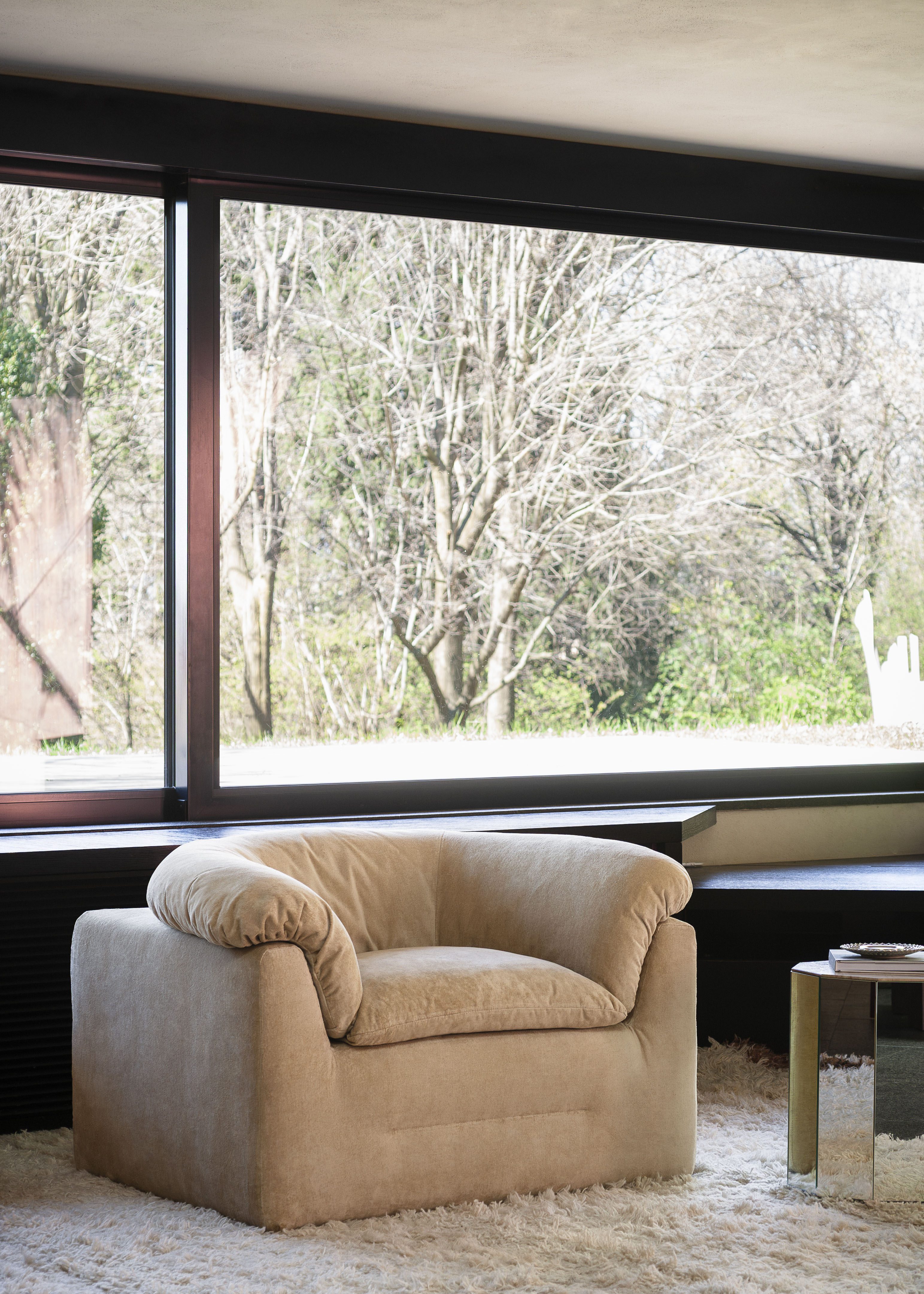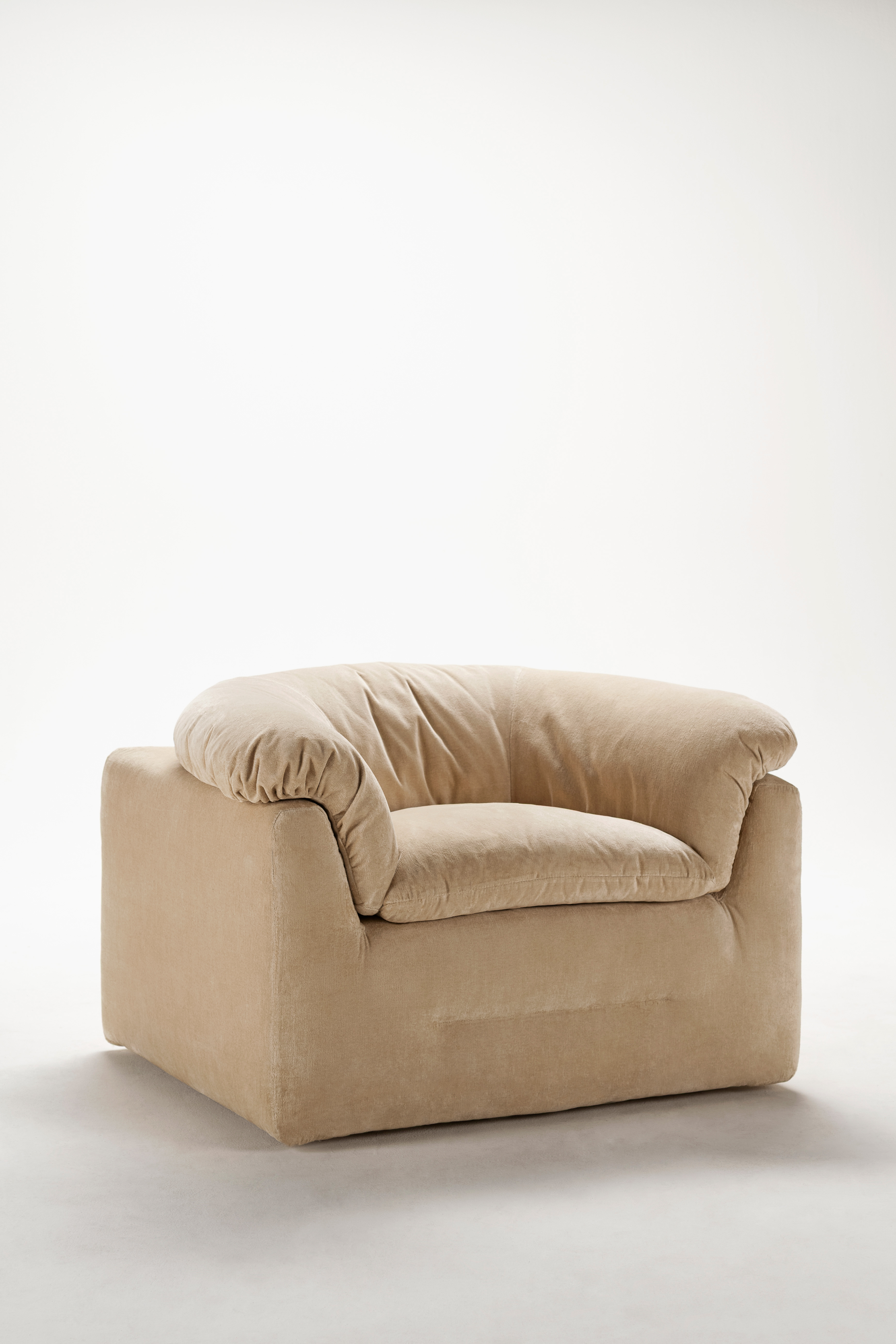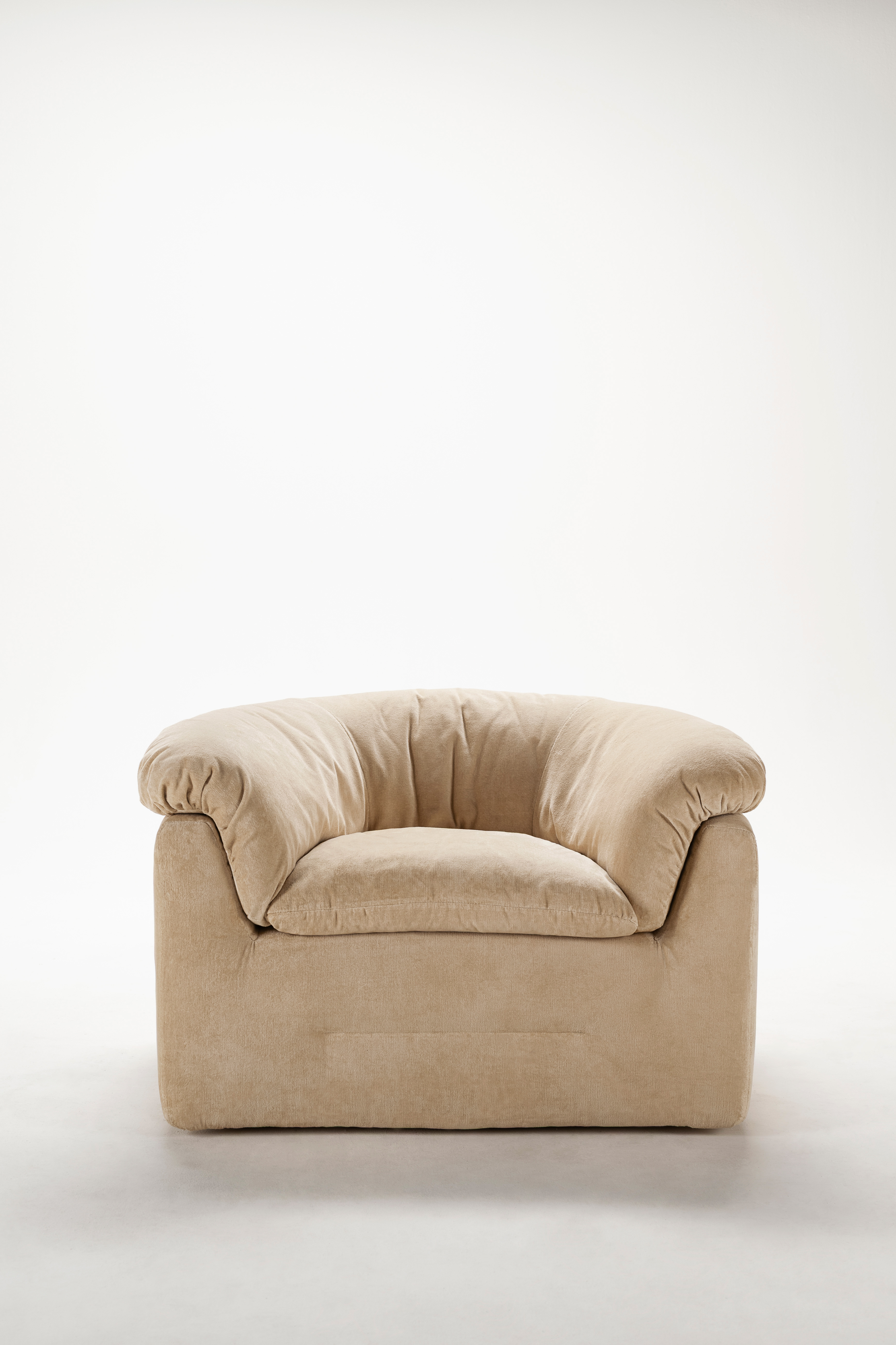 La poltrona riprende le linee soffici e scultoree del Butter Sofa, capace di seguire il corpo e i suoi movimenti in un utilizzo libero e informale. L’ampia seduta accoglie un generoso cuscino schienale che avvolge l’intera struttura e sporge lungo i bordi superiori, definendo un profilo morbido e continuo. Le cuciture laterali enfatizzano i volumi imbottiti, rendendoli pieni e bombati, per favorire relax e spontaneità nello spazio domestico.