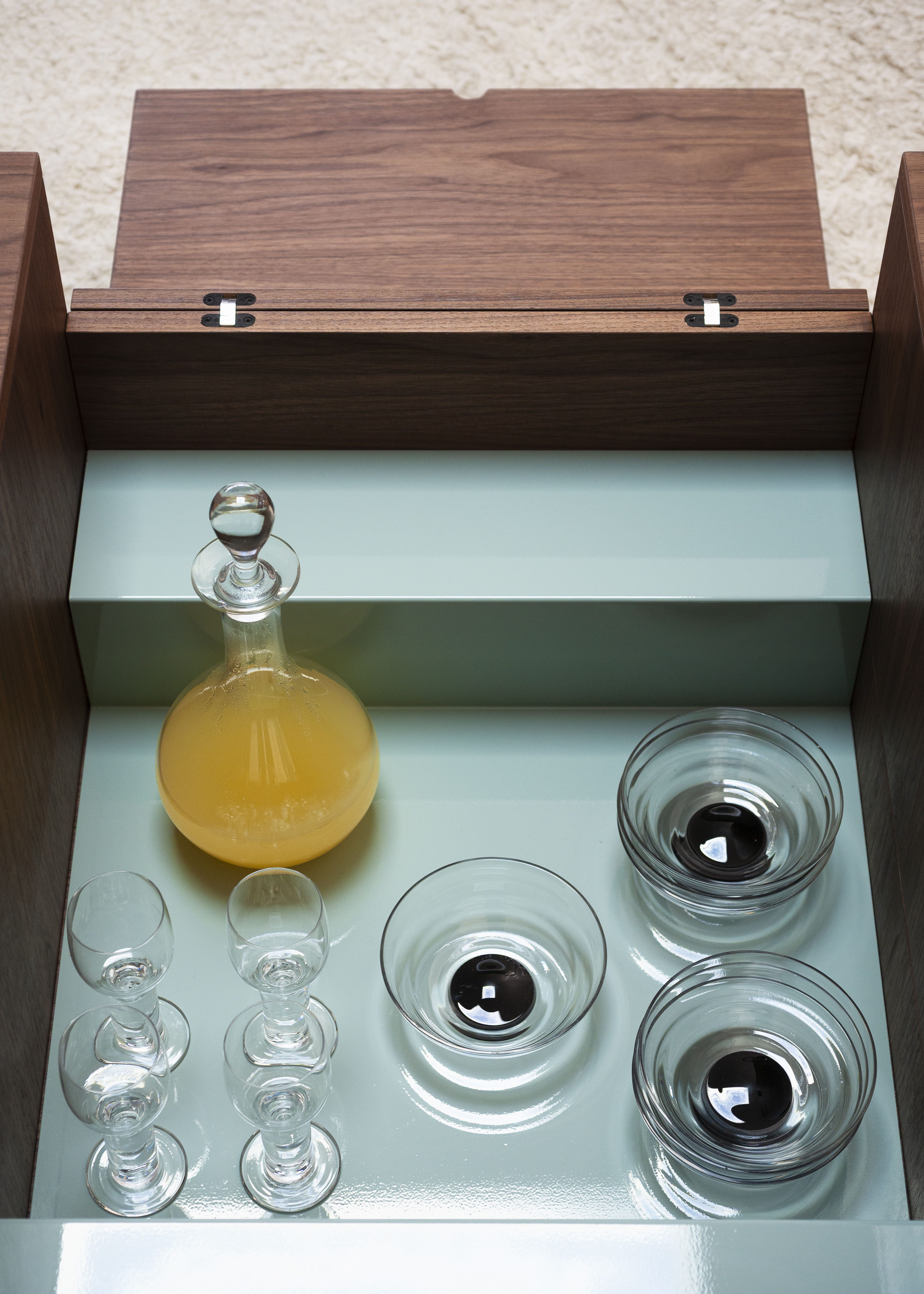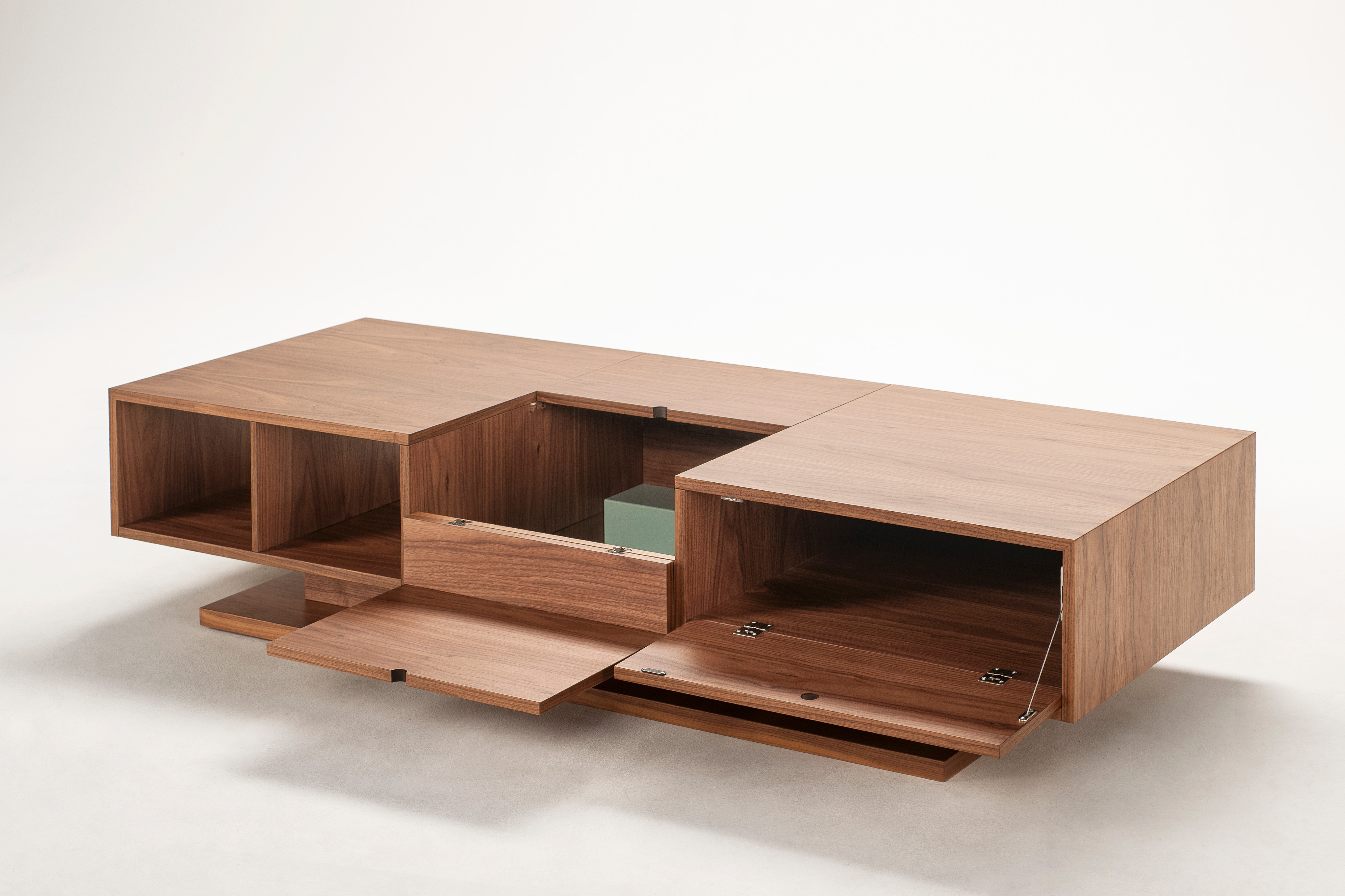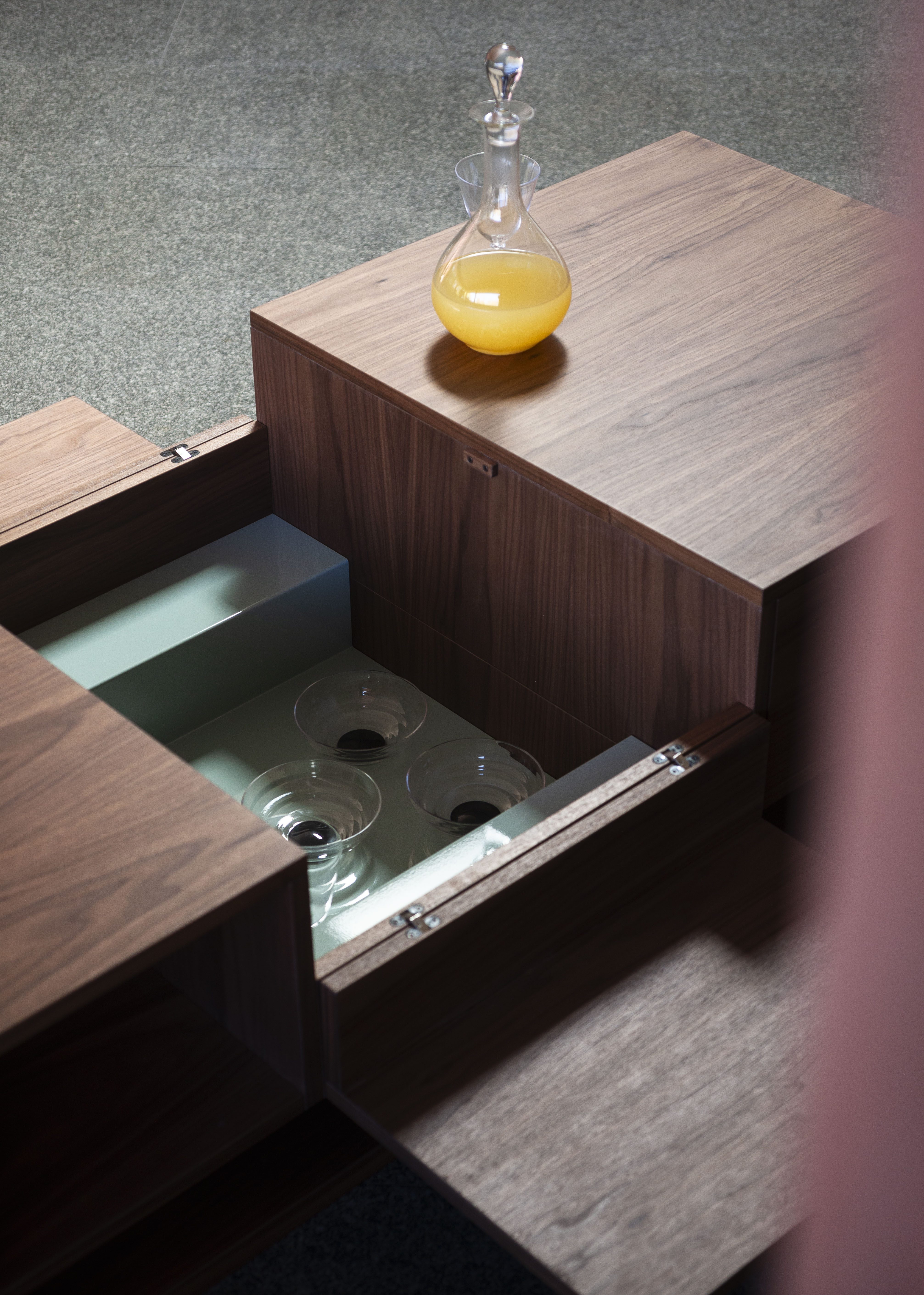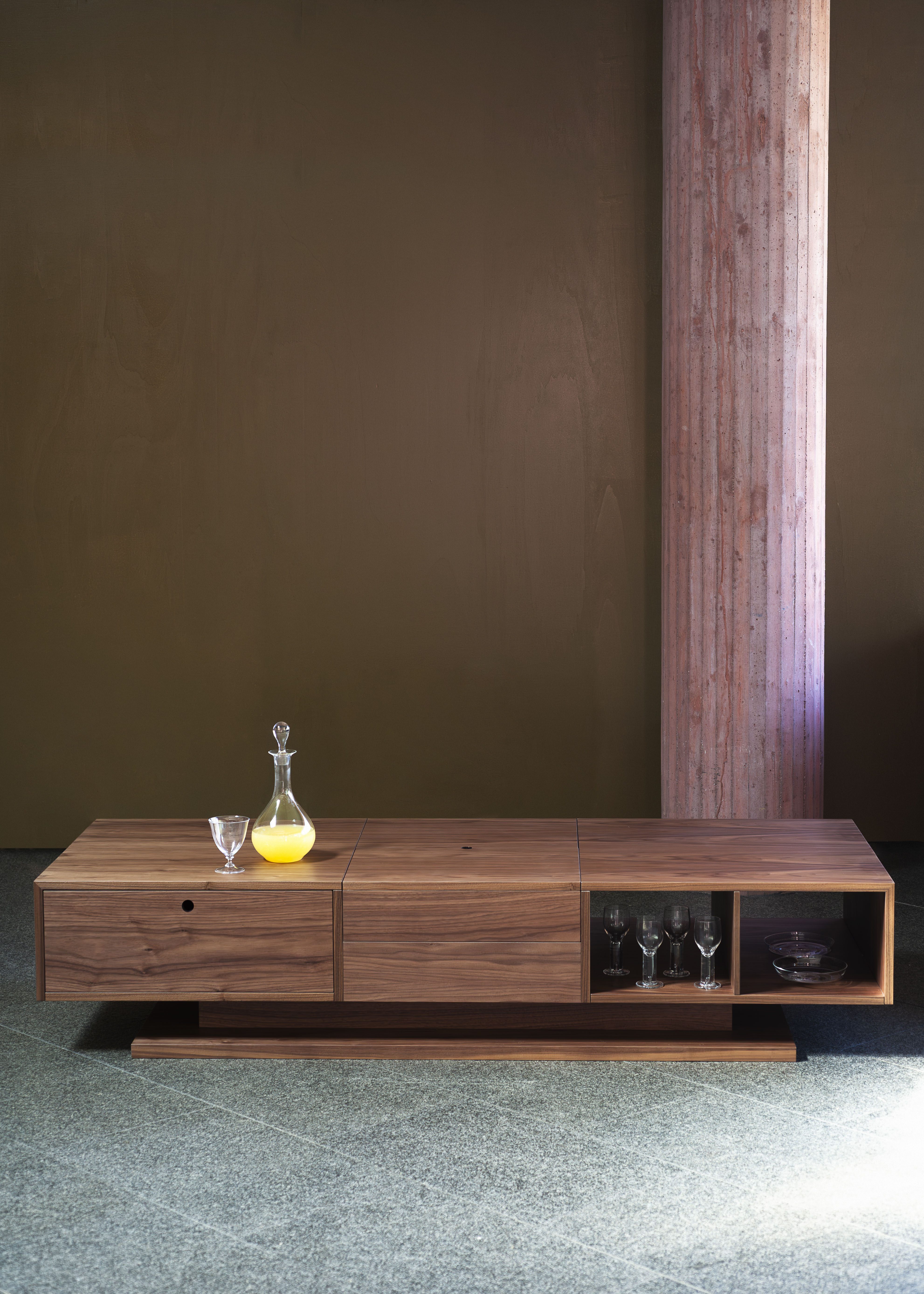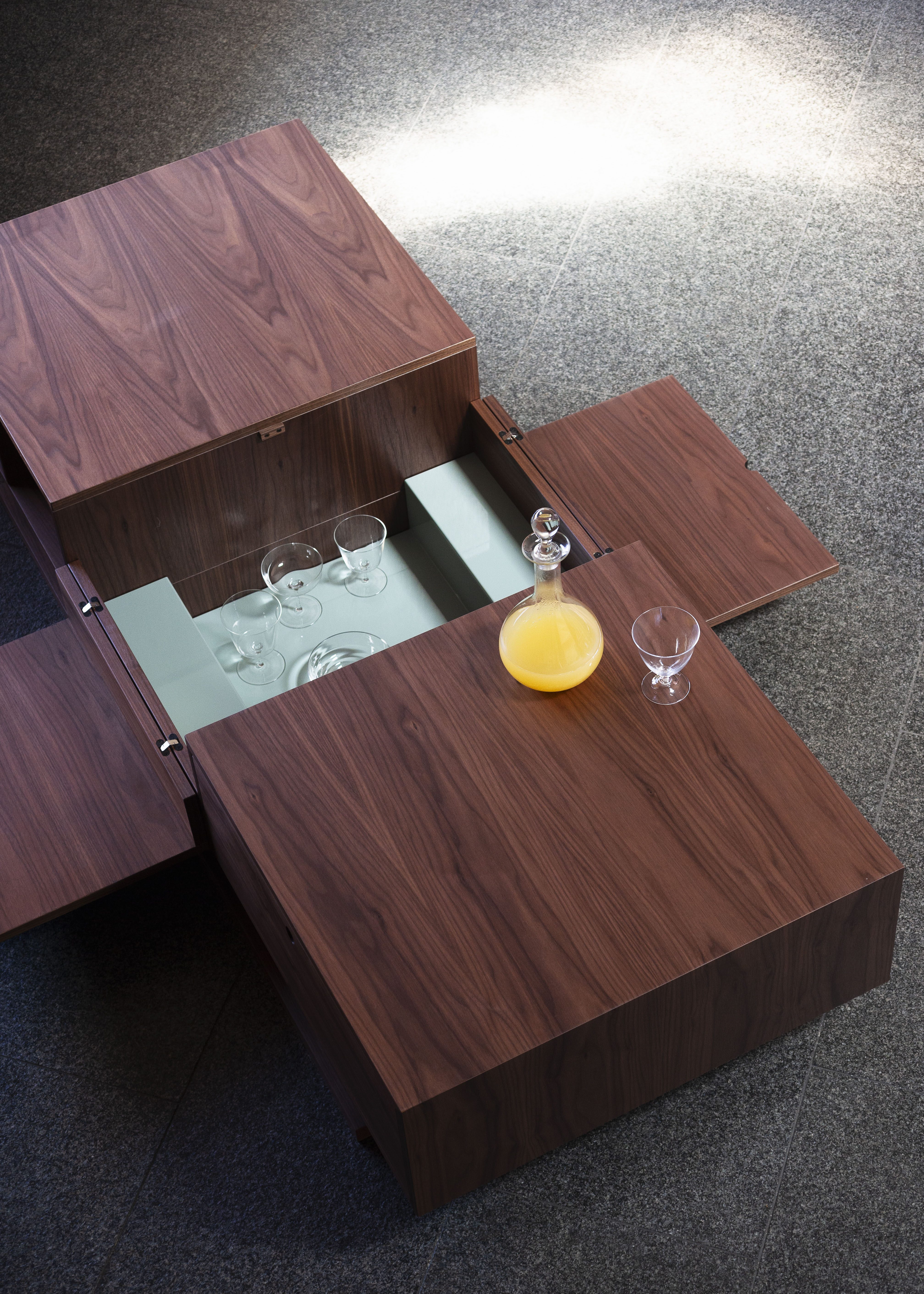 Core non è un semplice complemento, ma una presenza che stimola la condivisione e l’informalità. Il progetto di Tacchini recupera la memoria dei tavoli bar domestici per accompagnare gli ambienti fluidi della casa contemporanea, senza imporre posture o utilizzi. Un tavolo basso si apre e si svela. La superficie diventa piano d’appoggio, il volume si trasforma in contenitore: oggetti e rituali quotidiani trovano posto all’interno, mentre l’apertura, integrata nel disegno, naturale e intuitiva, lascia spazio all’esperienza e alla relazione.
