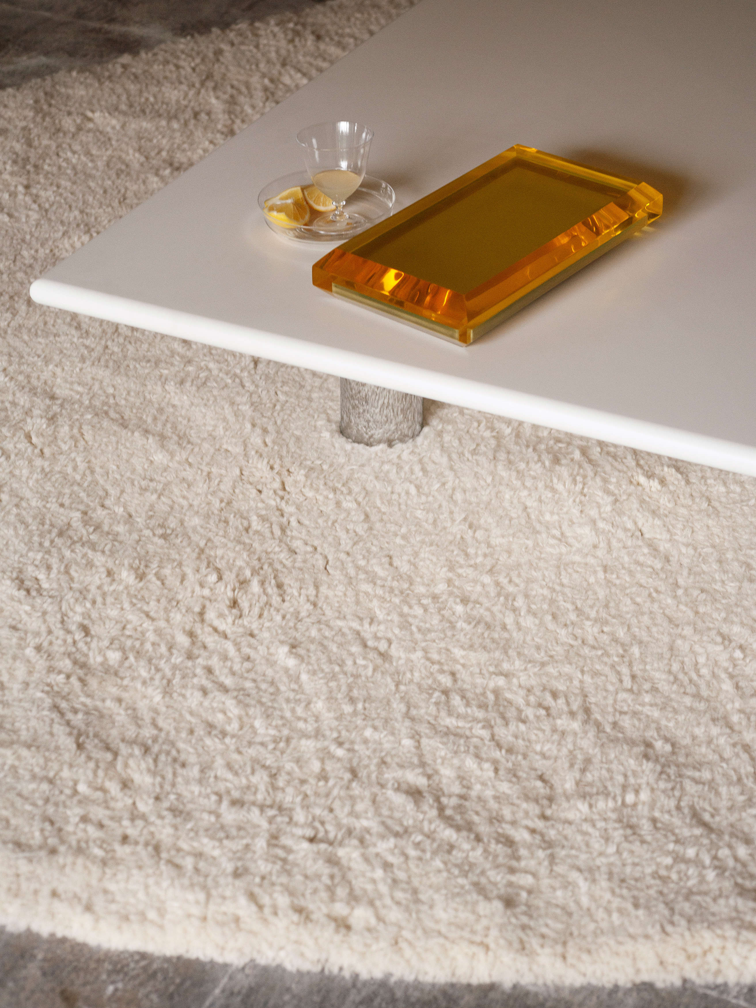 In questo contesto, il divano Butter di Faye Toogood, il tavolo Tako di Cini Boeri e il tappeto Onigiri di Studiopepe (parte della collezione 2026) si integrano naturalmente, instaurando un dialogo con le superfici in cemento, le geometrie rigorose e il carattere rarefatto dell’abitazione.