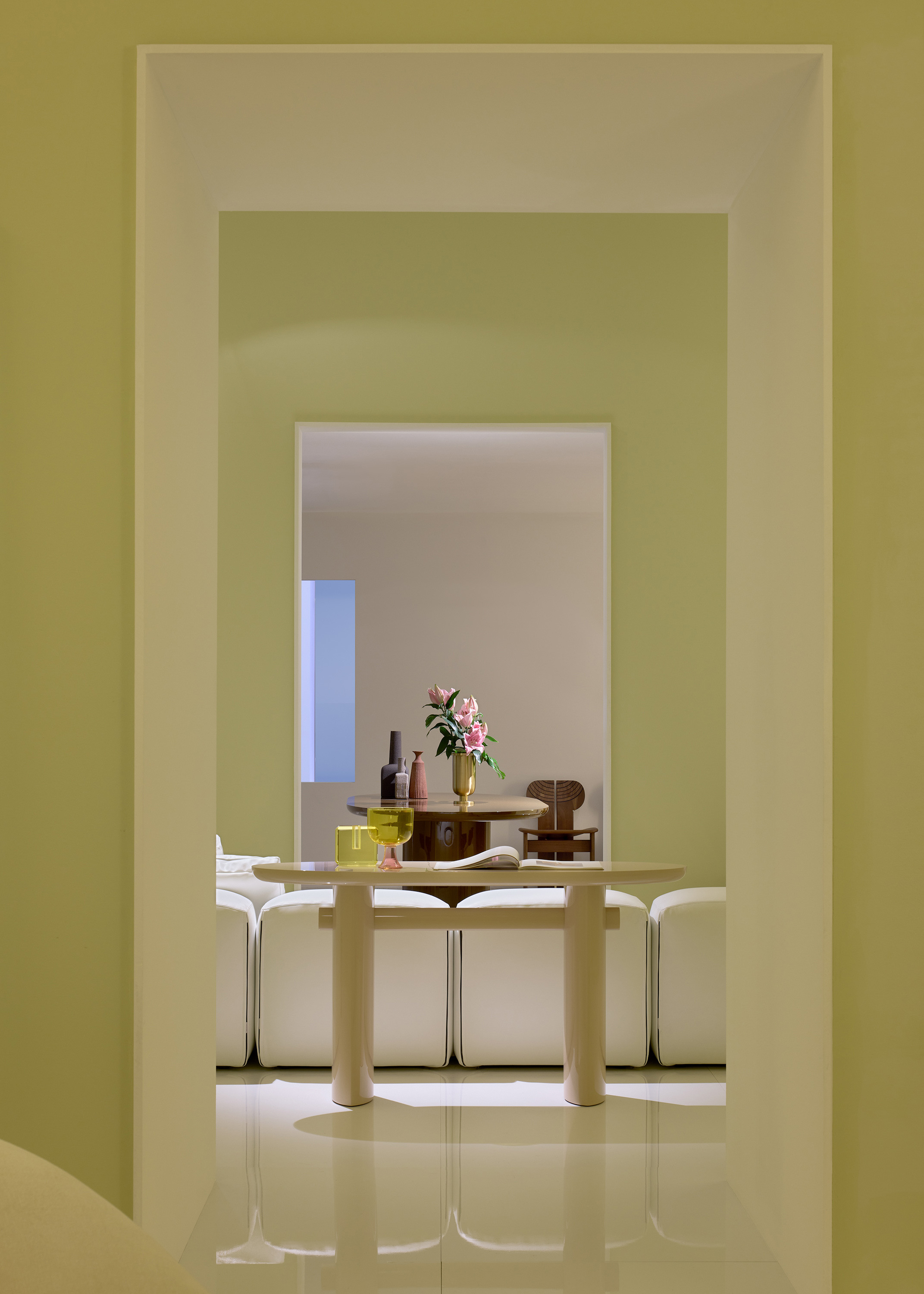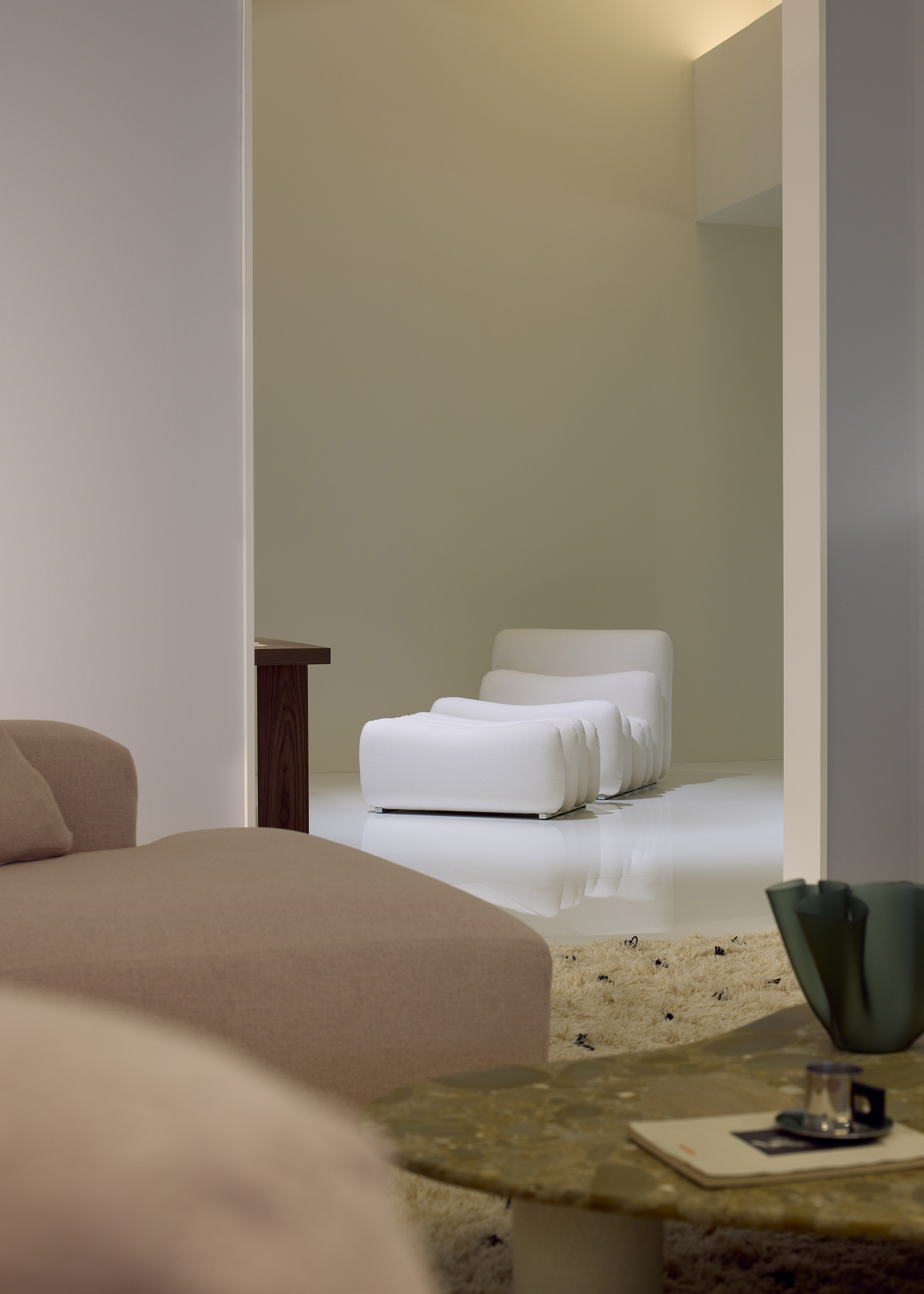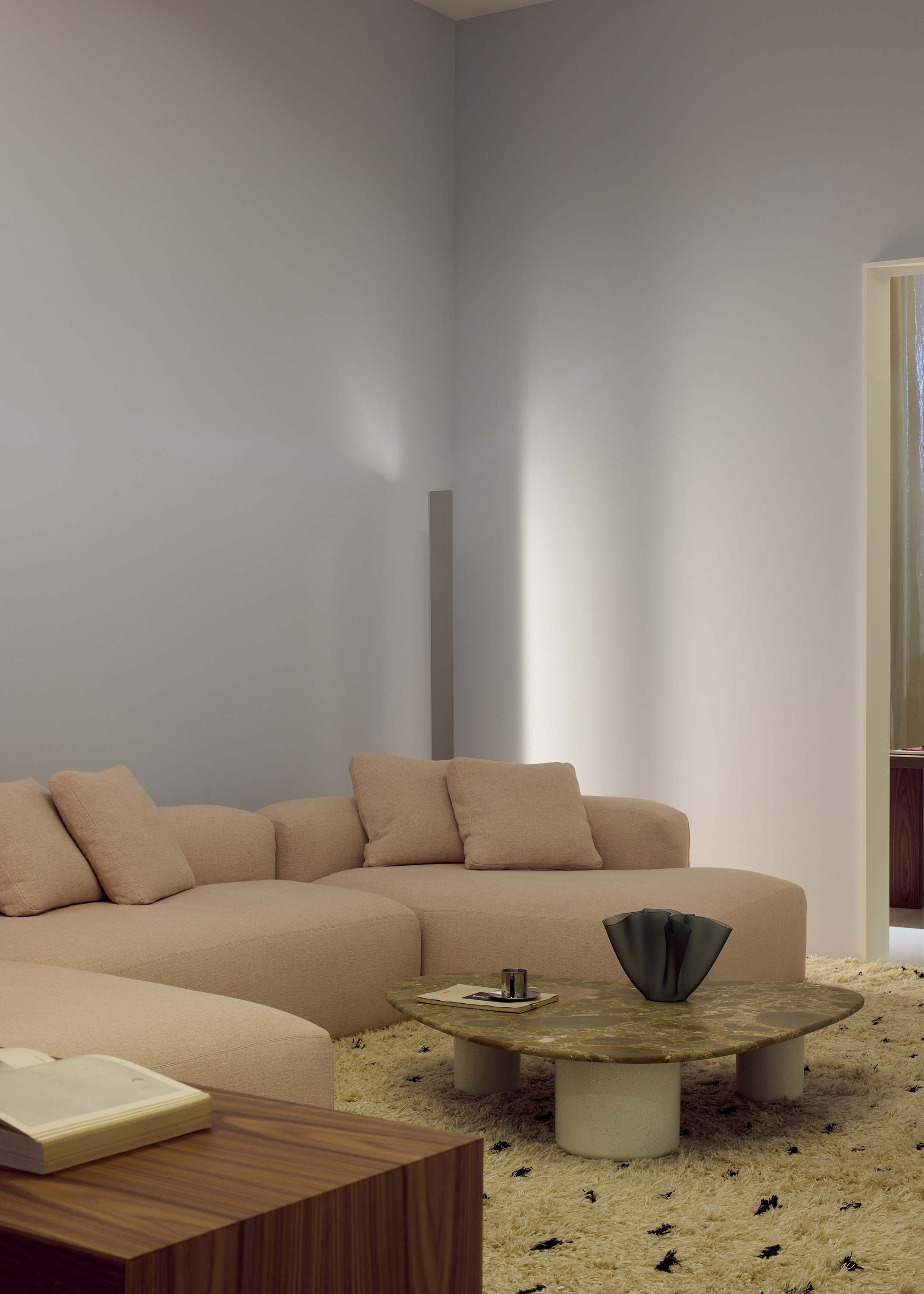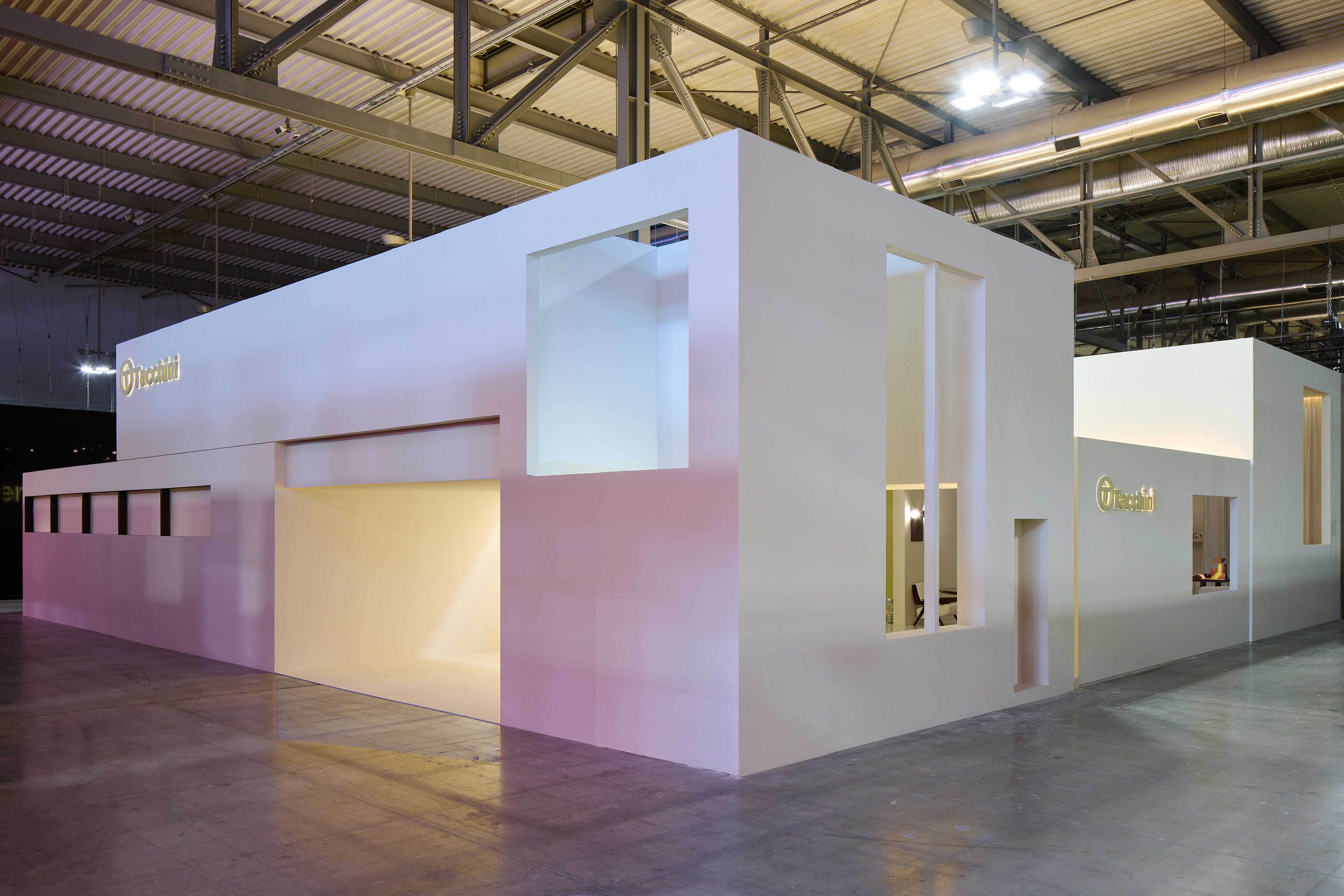 The stand, designed by Matteo Fiorini (Studio LYS) with styling by Charlotte de La Grandière, presents itself as a collection of pure volumes shaped by subtraction. Slits and openings interrupt the continuity of the surfaces, while grazing light accentuates the geometries, guiding the audience through an immersive journey. Inside, a sequence of intimate spaces evokes the closeness of the domestic dimension. A balance between rigor and softness takes shape through a neutral palette and tactile textures, enhancing the sense of calm and transforming the space into an enveloping refuge.