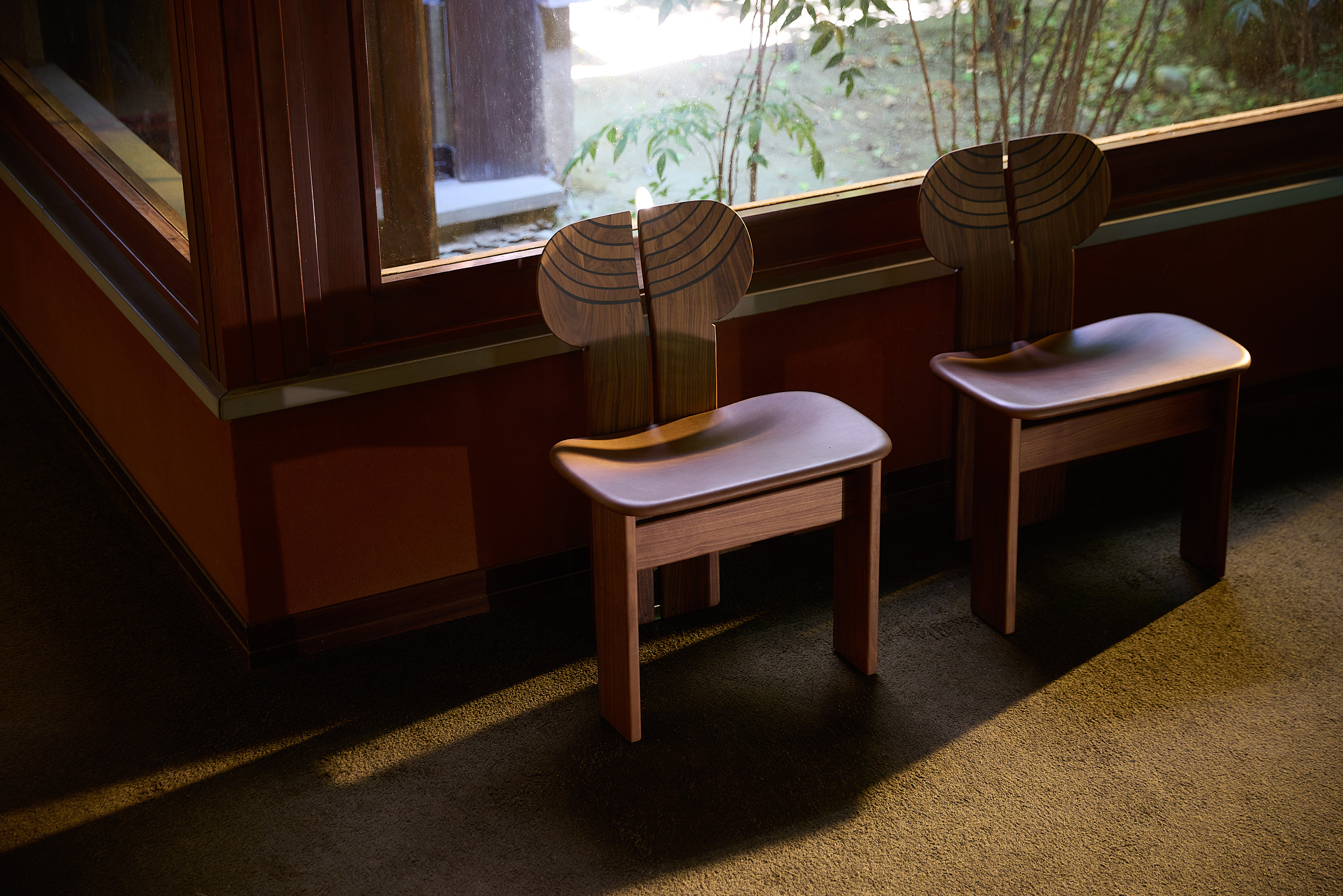 A re-edition of the original chair by Afra and Tobia Scarpa, Africa is a tribute to the ancient art of cabinetmaking: from the frame — a masterpiece of canaletto walnut veneer — to the backrest: crafted as a single piece and then refined into two mirrored sections, it features delicate hand-finishing that reveals layers of different wood essences, creating marvellous chromatic effects. The backrest and rear legs, joined only at the base, form a wide gap that adds flexibility to the seat and evokes a totemic image.