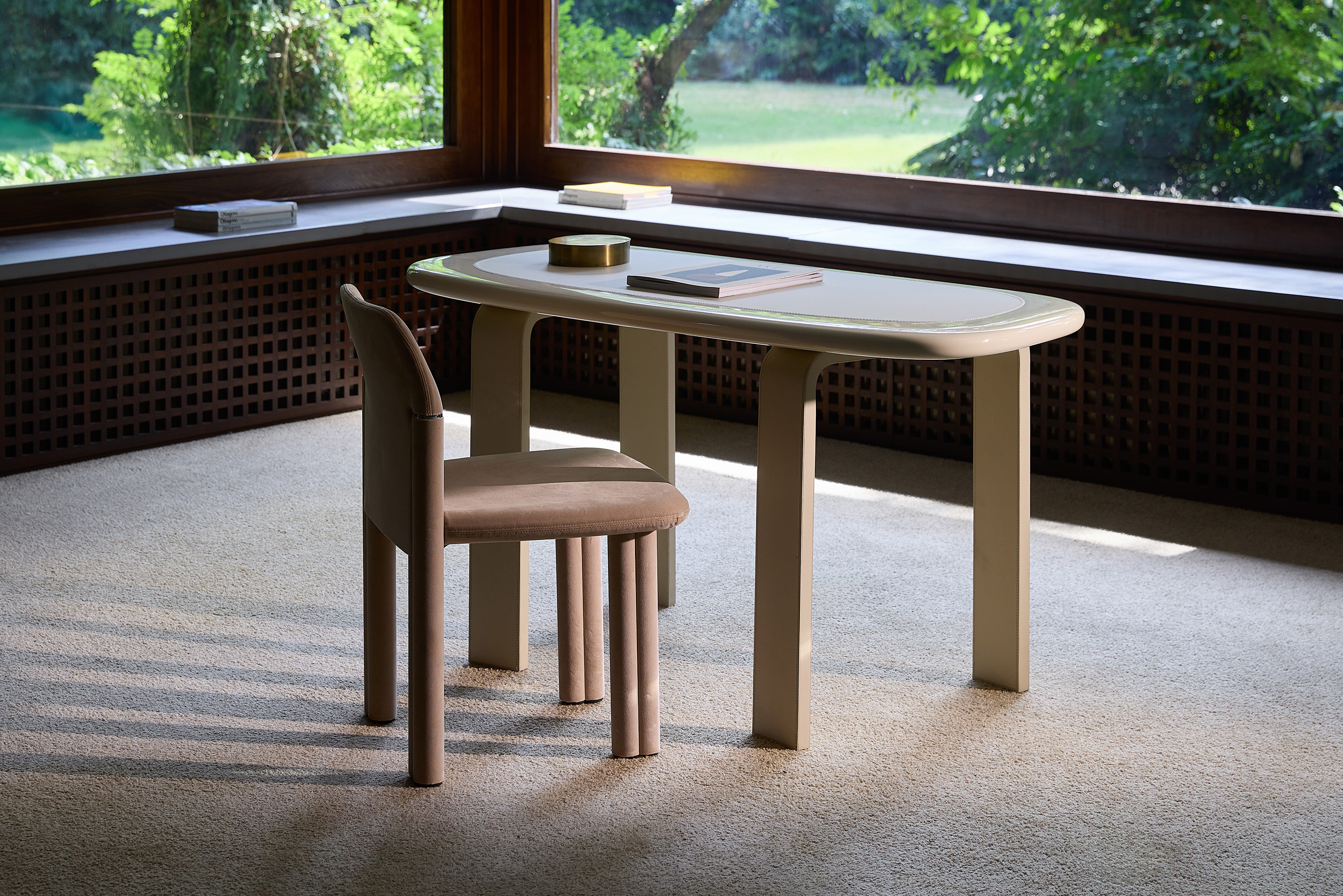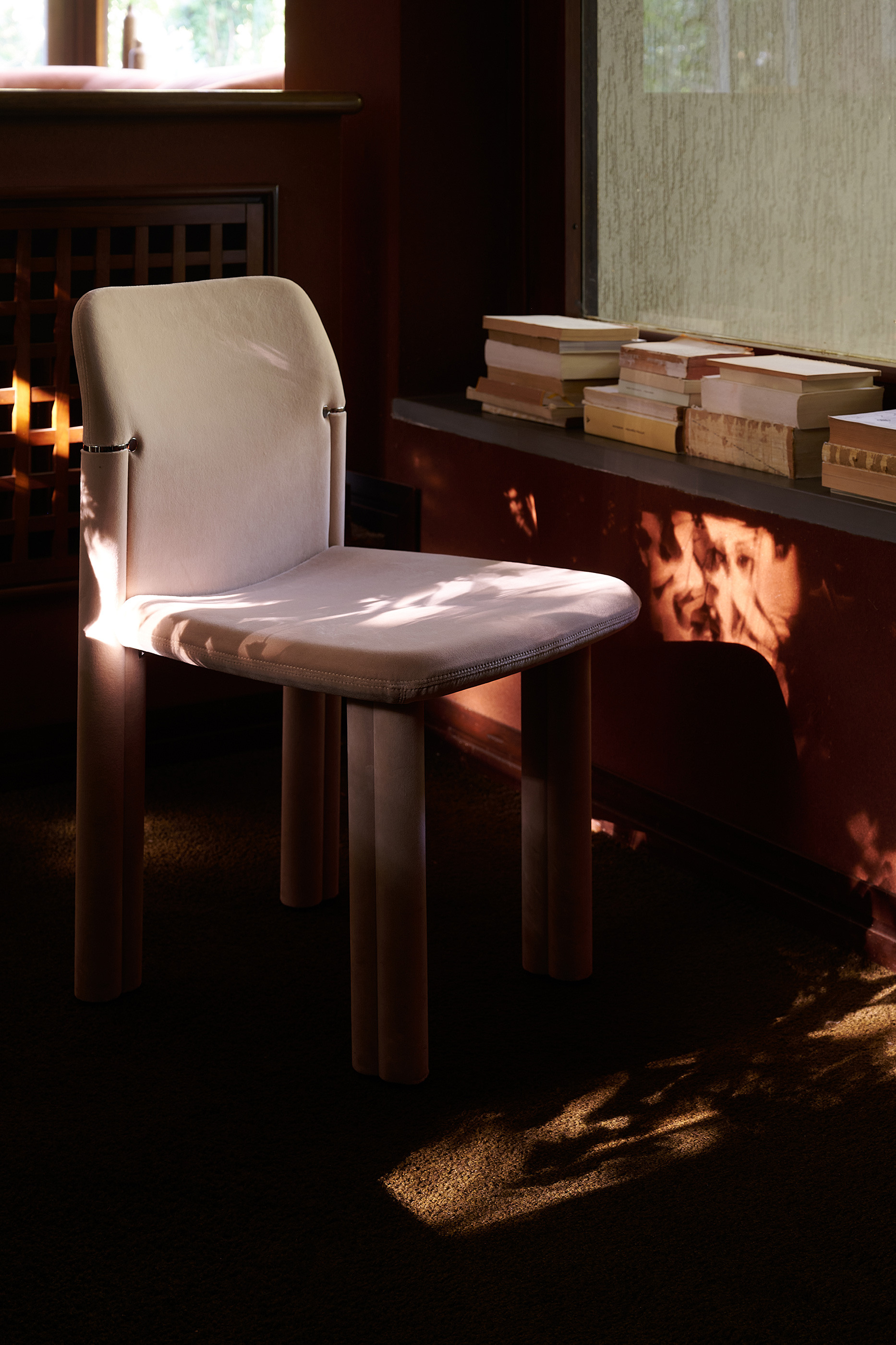 In Sempronia, circular elements interlock into a double circle that evokes the signature of the great Maestro – Tobia Scarpa – who designed it. Paired legs, created by the intersection of two cylinders, extend to the backrest, connected by a slender metal armrest that merges harmony and functionality. The bold character of the 1980s aesthetic does not forgo the comfort of a completely reconfigured seat that is even more welcoming, thanks to the soft padding.